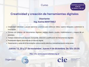Curso sobre Creatividad y creación de herramientas digitales se realizará los días jueves 13, 20 y 27 de noviembre. Jueves 4 de diciembre. De 18 a 20:30. Presencial en el SUM del CIE, San Martín 1748, Santa Fe.